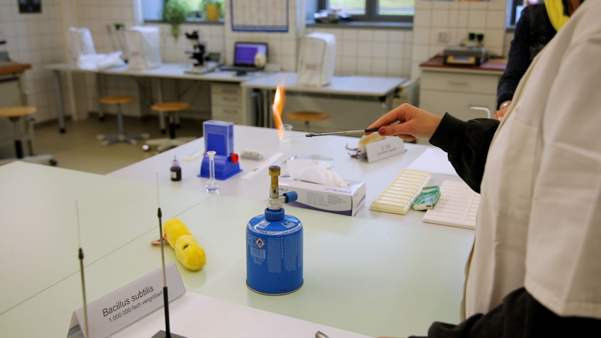 In the laboratory for applied microbiology, the biological principles and recognised working techniques of a modern microbiological laboratory are taught. Based on a comprehensive introduction to the biology of bacteria and fungi, the techniques and methods of microscopy, sterile work, cultivation as well as the isolation and identification of microorganisms can be successively dealt with theoretically and practically.