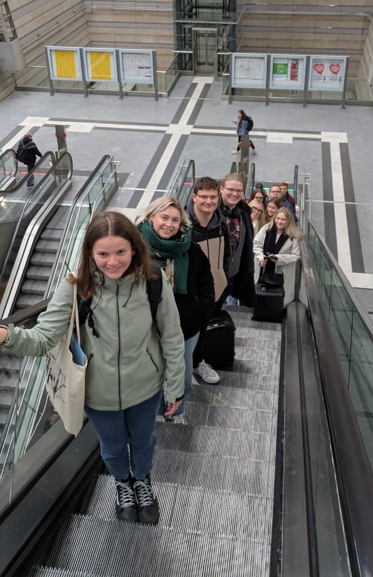Eine Gruppe von Studierenden fährt mit Gepäck eine Rolltreppe im modernen Leipziger Hauptbahnhof hinauf. Die Studierenden stehen in einer Reihe, blicken zur Kamera und wirken gut gelaunt.