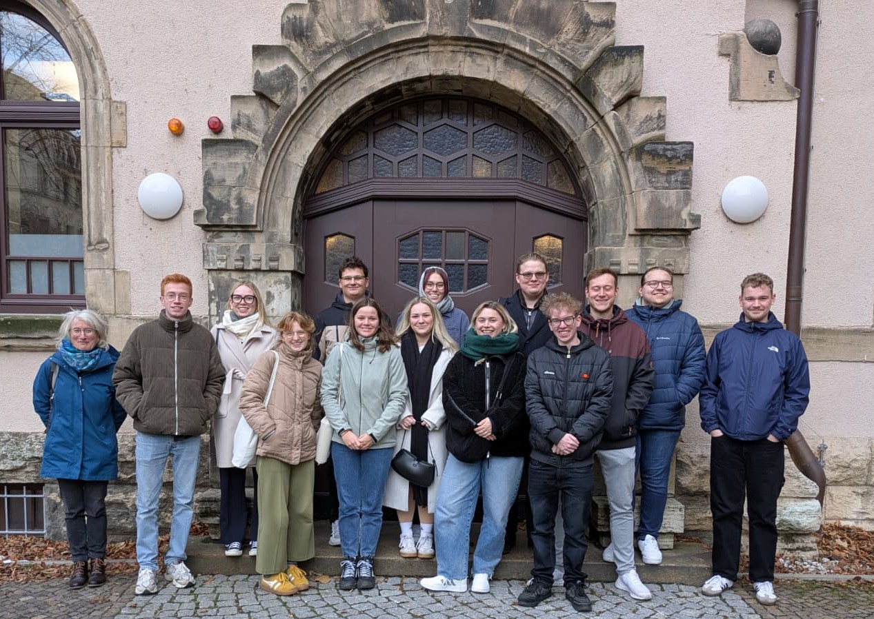 ie gesamte Gruppe posiert vor dem Eingangsportal eines historischen Gebäudes mit Steinbogen und Holztür, das Sozialamt Leipzig. Die Studierenden tragen Jacken und Winterkleidung.