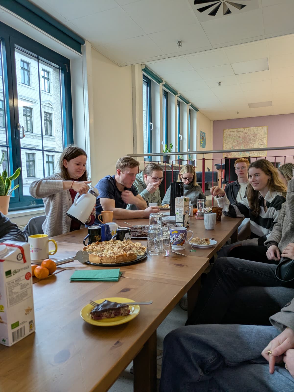Eine Gruppe von Studierenden sitzt an einem langen Tisch mit Kuchen, Getränken und Geschirr und frühstückt gemeinsam in einem lichtdurchfluteten Raum. Eine Person schenkt Tee oder Kaffee aus einem Wasserkocher ein. Im Hintergrund sind große Fenster und eine Weltkarte an der Wand zu sehen.
