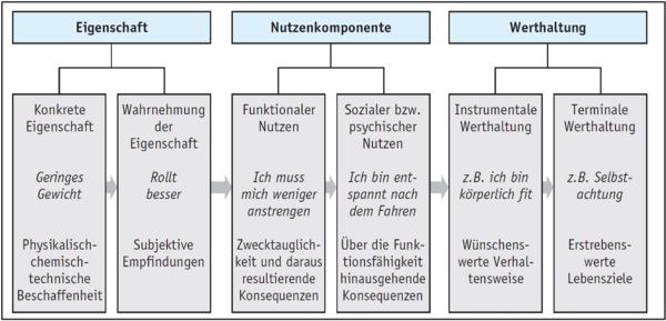 In der Konsumentenverhaltensforschung hat sich ein Ansatz etabliert, der dazu dient, die Zusammenhänge zwischen objektiv vorhandenen Produkteigenschaften einerseits und von den Konsumenten subjektiv wahrgenommenen und mit bestimmten Nutzenstiftungen verbundenen Produkteigenschaften andererseits zu analysieren.